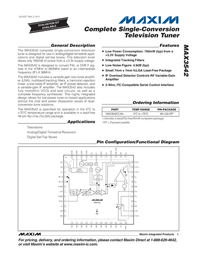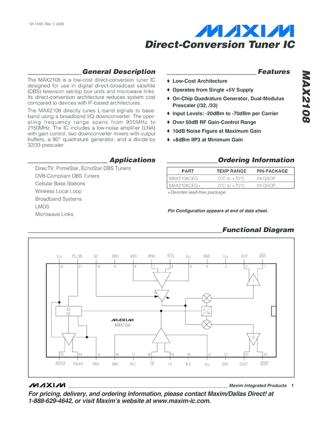MAX2120 Complete, Direct-Conversion Tuner for DVB-S and Free-to-Air Applications