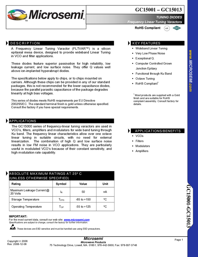 30 V Abrupt Junction Tuning Varactors GC1500A - GC1513
