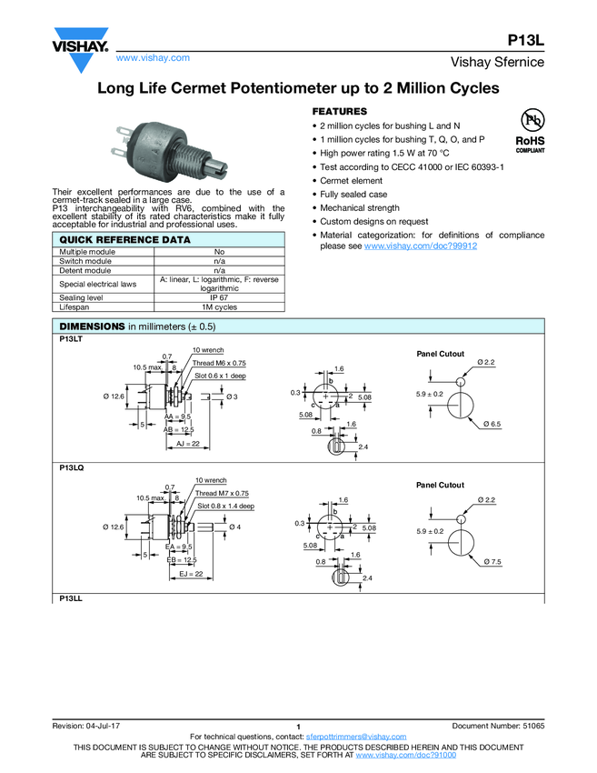 Res Conductive Plastic POT 5K Ohm 20% 3/10W 1(Elec)/1(Mech)Turns 6.35mm (22.2 X 30.2mm) Turret Panel Mount