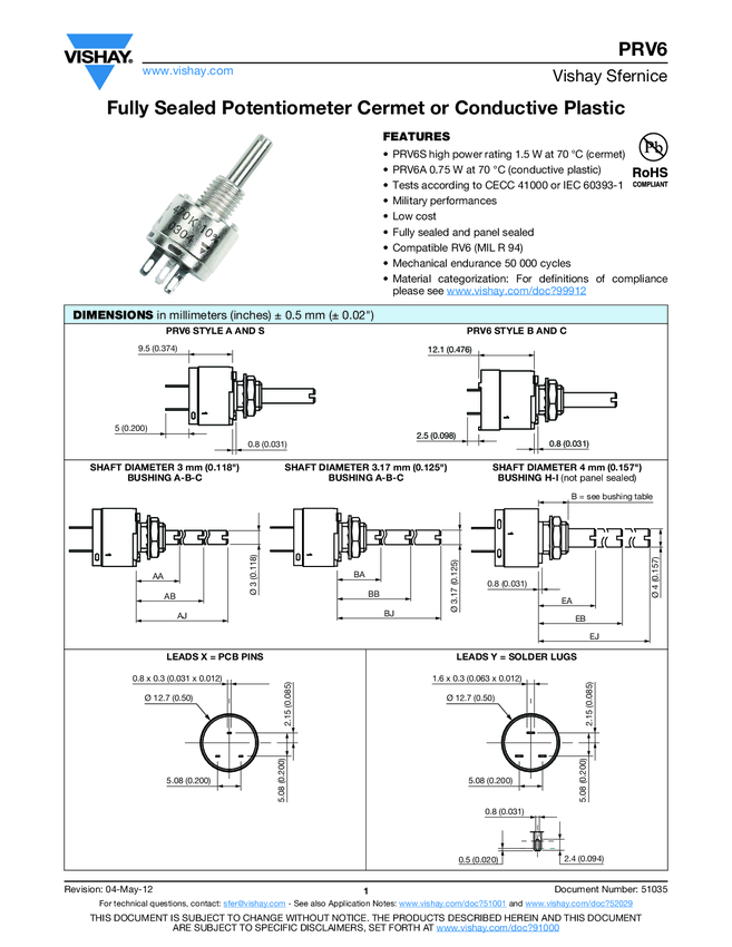 Res Cermet POT 10K Ohm 20% 1.5W 1(Elec)/1(Mech) Turns 6mm (14 X 35.5mm) Panel Mount Bulk