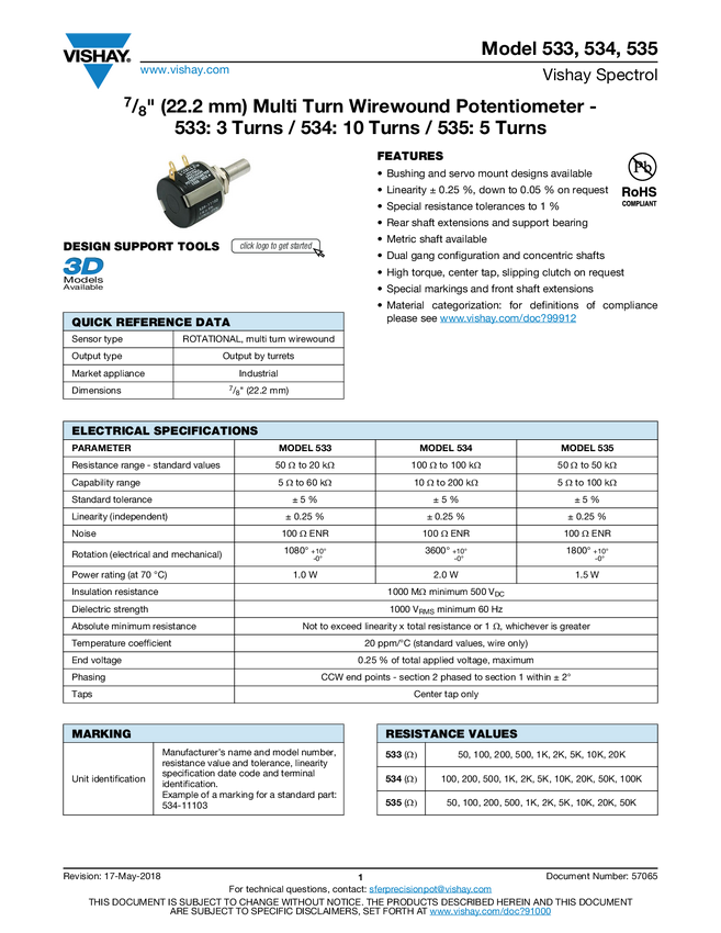 7/8" (22.2 mm) Multi Turn Wirewound Potentiometer - 533: 3 Turns / 534: 10 Turns / 535: 5 Turns