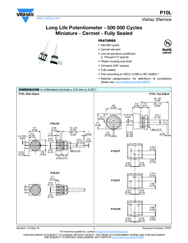 Res Cermet POT 10K Ohm 10% 1/10W 1(Elec)/1(Mech)Turns 3mm (9.6 X 9.7 X 21.2mm) Pin Panel Mount/Thru-Hole Bulk