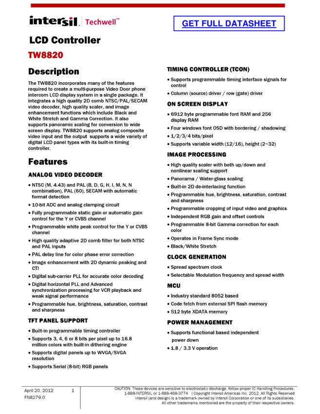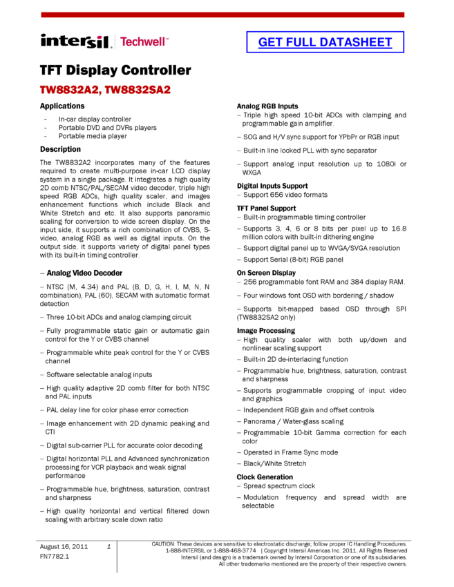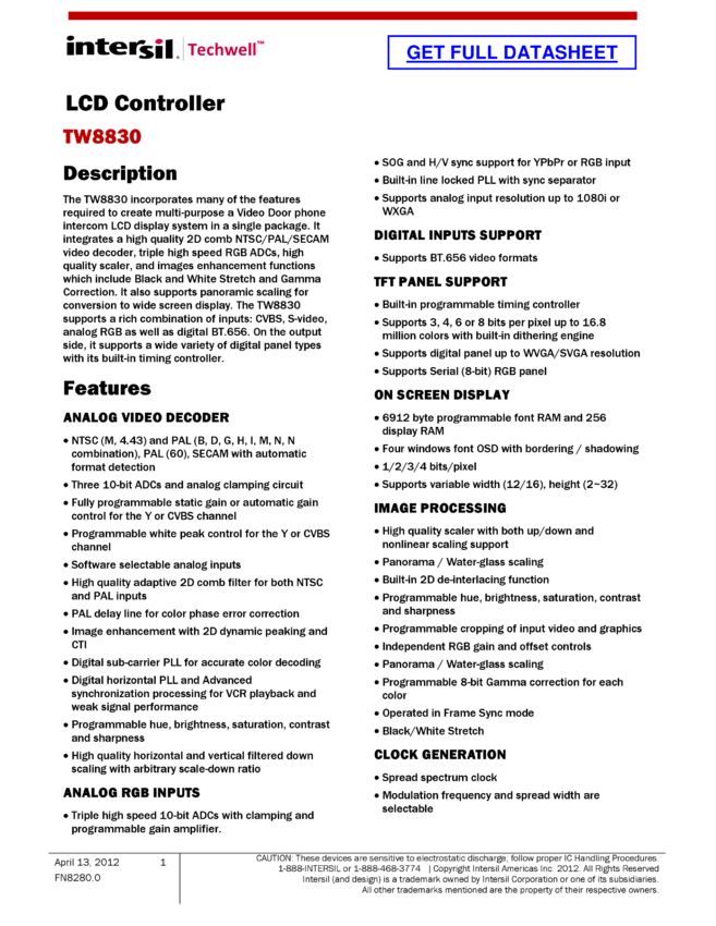 LCD Flat Panel Controller with Integrated NTSC/PAL/SECAM Decoder and Analog/Digital RGB/FB Input