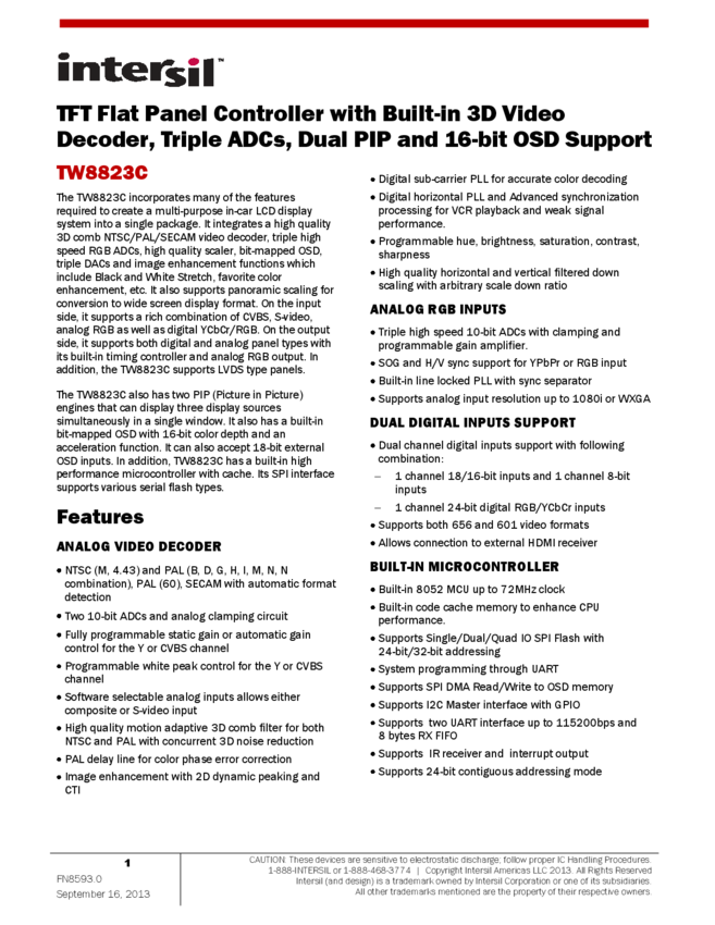 TFT Flat Panel Controller with Built-in 3D Video Decoder, Triple ADCs, Dual PIP and 16-bit OSD Support