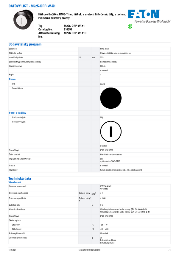 Eaton 216758 M22S-DRP-W-X1 Przycisk grzybkowy pierścień przedni z tworzywa sztucznego 1 szt.