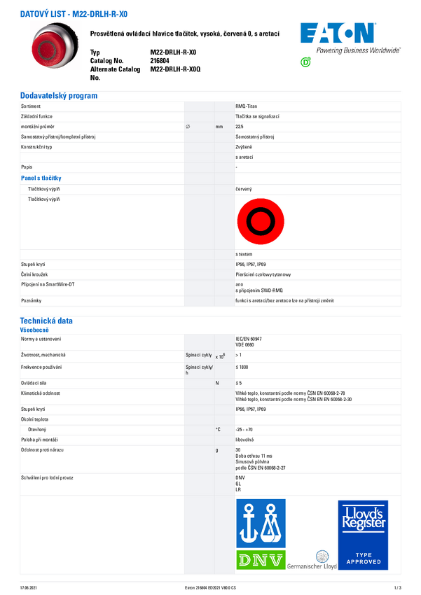 Eaton 216804 M22-DRLH-R-X0 Przycisk podświetlany pierścień przedni z tworzywa sztucznego 1 szt.