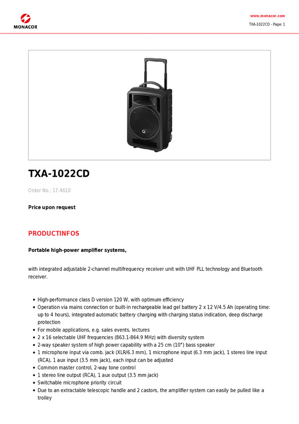 Głośnik przenośny PA Monacor TXA-1022CD, 20 - 20 000 Hz, 120 W/170 W, 10 cal, 19.2 kg