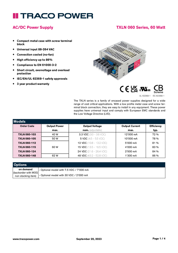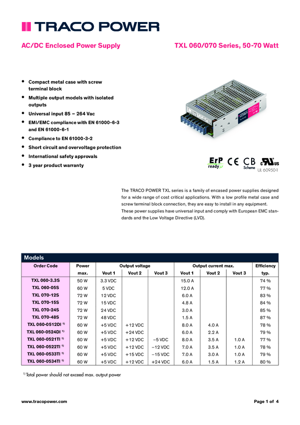 Zasilacz TracoPower TXL 060-3.3S 3.3 V/DC 15 A 60 W