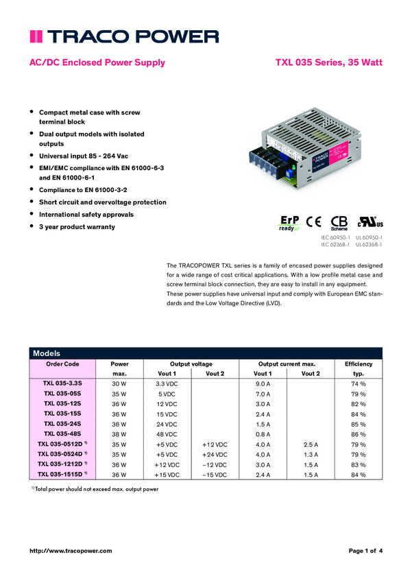 Zasilacz TracoPower TXL 035-3.3S 3.3 V/DC 9 A 35 W