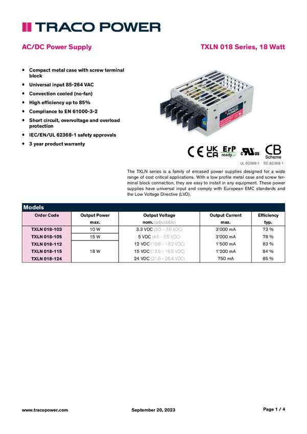 Moduł zasilacza AC/DC, zamknięty TracoPower TXLN 018-115 15 V/DC 1.2 A 18 W