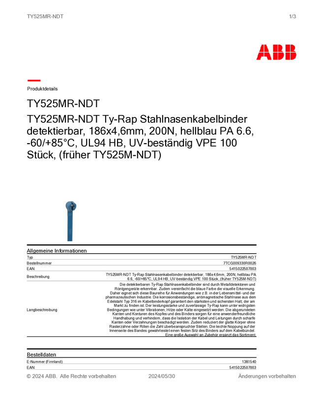 ABB 7TCG009330R0029 TY527MR-NDT Opaska kablowa 340 mm 7 mm niebieski 1 szt.