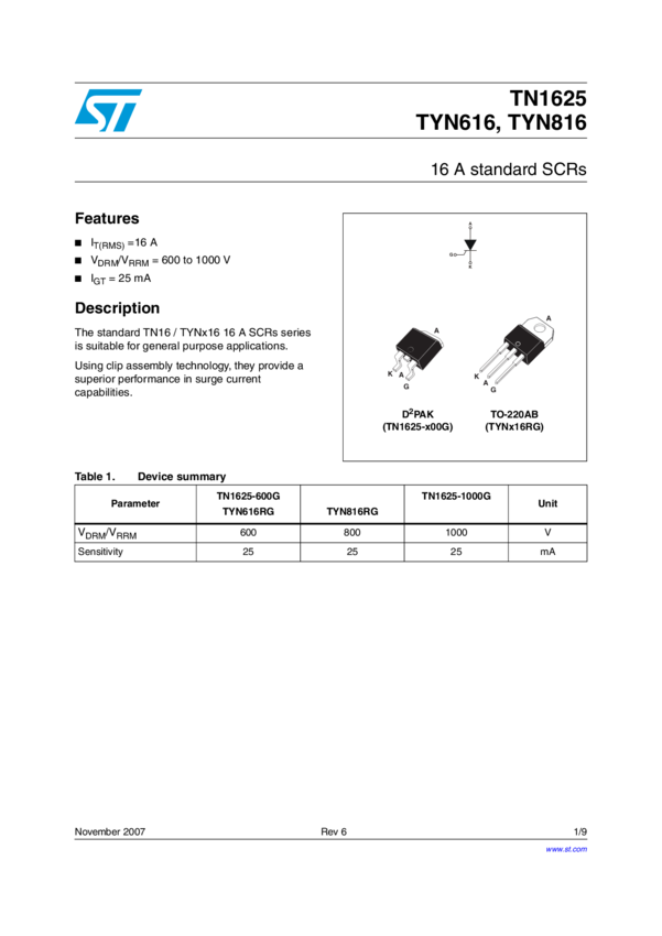 Tyrystor; TYN1012RG; 12A: 1000V; 15mA; TO220; THT; l=50szt.; STMicroelectronics; RoHS