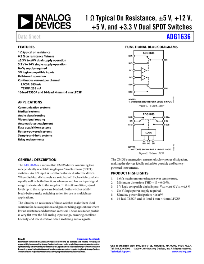 1 Ω Typical On Resistance, ±5 V, +12 V, +5 V, and +3.3 V Dual SPDT Switches