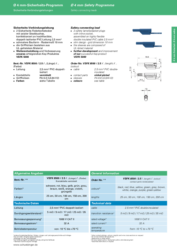 Schützinger VSFK 8700 / 2.5 / 200 / RT Przewód pomiarowy bezpieczny złącze męskie 4 mm złącze męskie 4 mm 200.00 cm czer