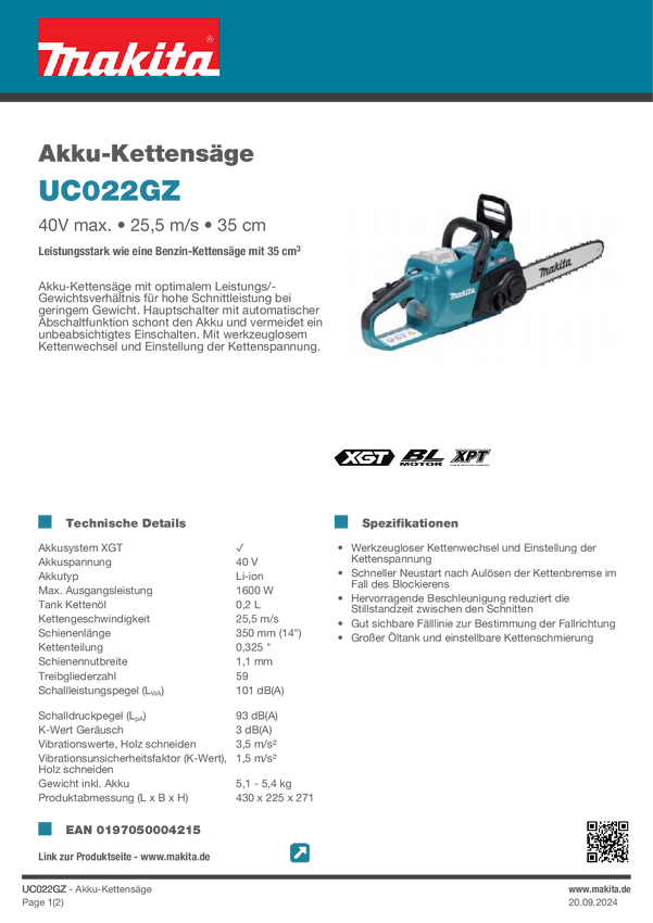 Makita UC022GZ akumulatorowy Piła łańcuchowa bez akumulatora 1600 W 40 V Długość prowadnicy 350 mm