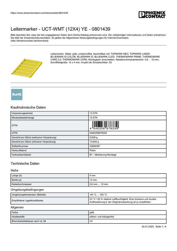 Phoenix Contact 0801439 UCT-WMT (12X4) YE Tabliczka do etykietowania Sposób montażu: wpychanie żółty Ilość znaczników: 5