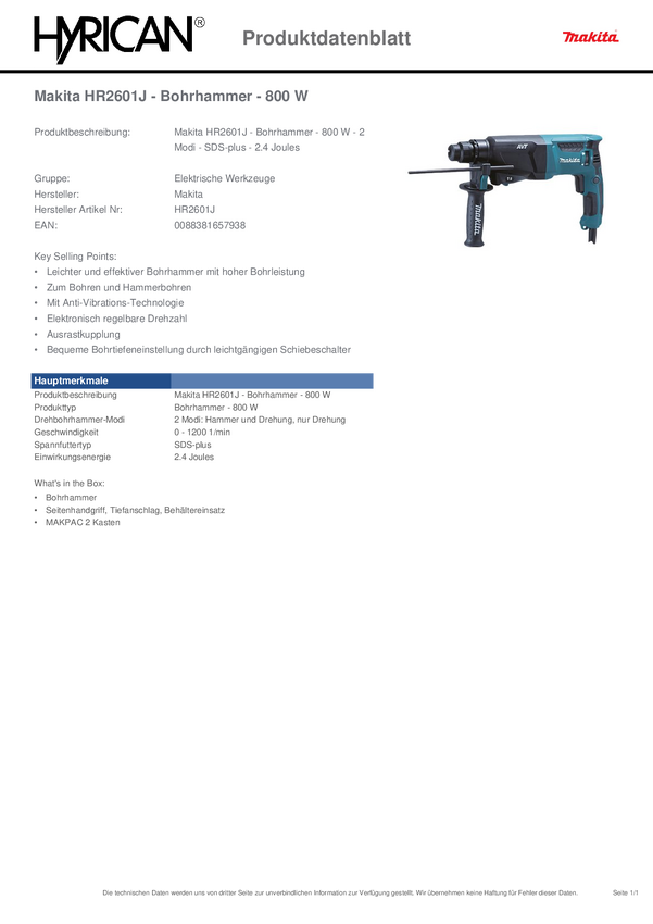 Młot udarowo-obrotowy Makita S_0380_2368874 800 W HR2601J 1 szt.