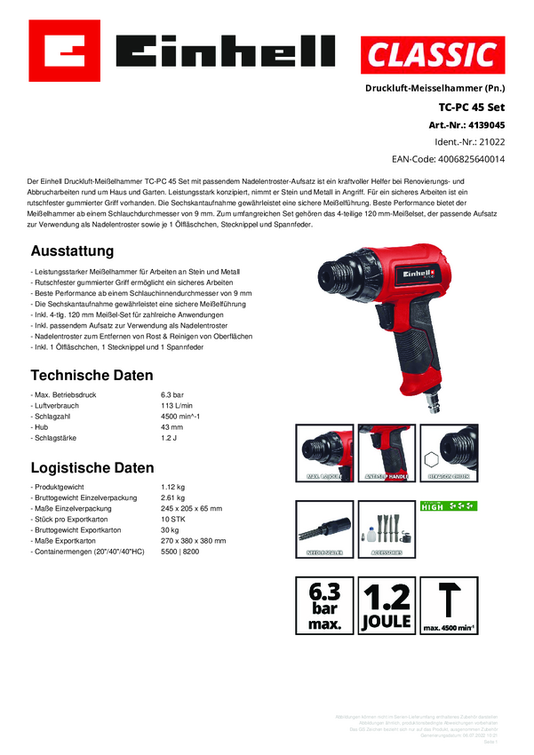 Młot udarowy pneumatyczny Einhell TC-PC 45 Set 4139045 6.3 bar