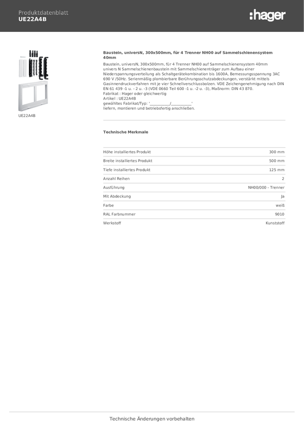 Hager UE21E4 Moduł czysty biały (ral 9010) 4 styki 630 A 1 szt.