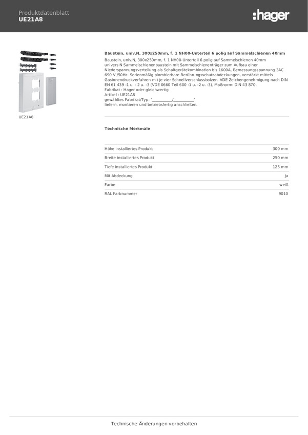 Hager UE21A8 Moduł czysty biały (ral 9010) 6 styków 355 A 1 szt.