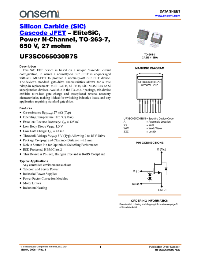 Silicon Carbide (SiC) Cascode JFET - EliteSiC, 27 mohm, 650V, D2PAK-7L