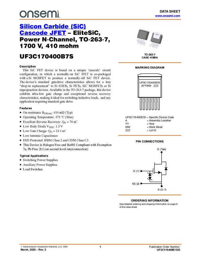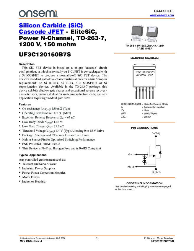Silicon Carbide (SiC) Cascode JFET - EliteSiC, 410 mohm, 1700V, D2PAK-7L