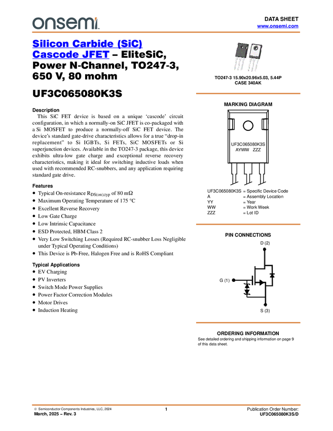 Silicon Carbide (SiC) Cascode JFET - EliteSiC, 80 mohm, 1200V, TO-247-3L