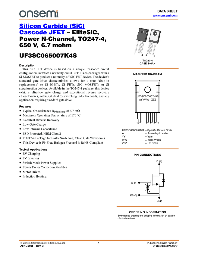 Silicon Carbide (SiC) Cascode JFET - EliteSiC, 7 mohm, 650V, TO-247-4L