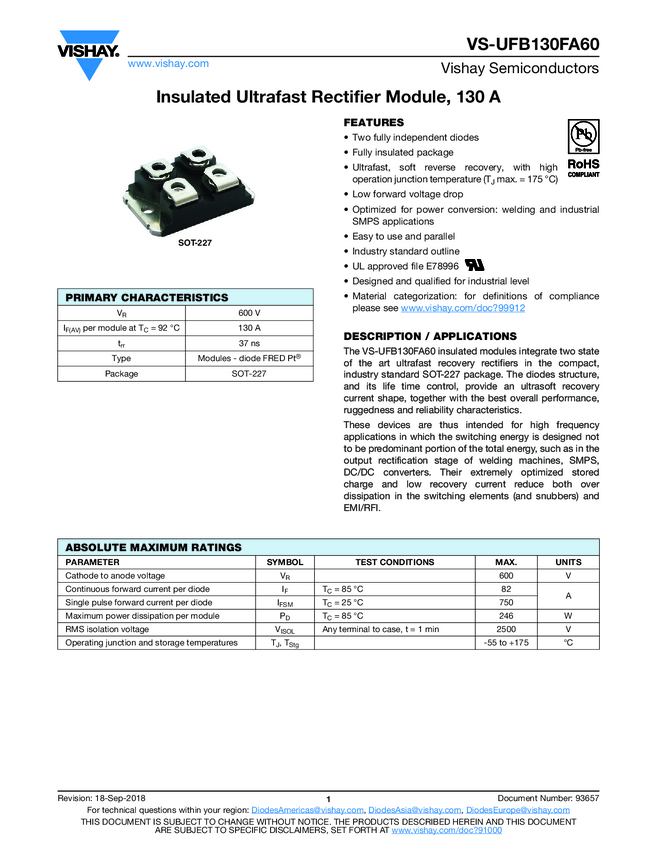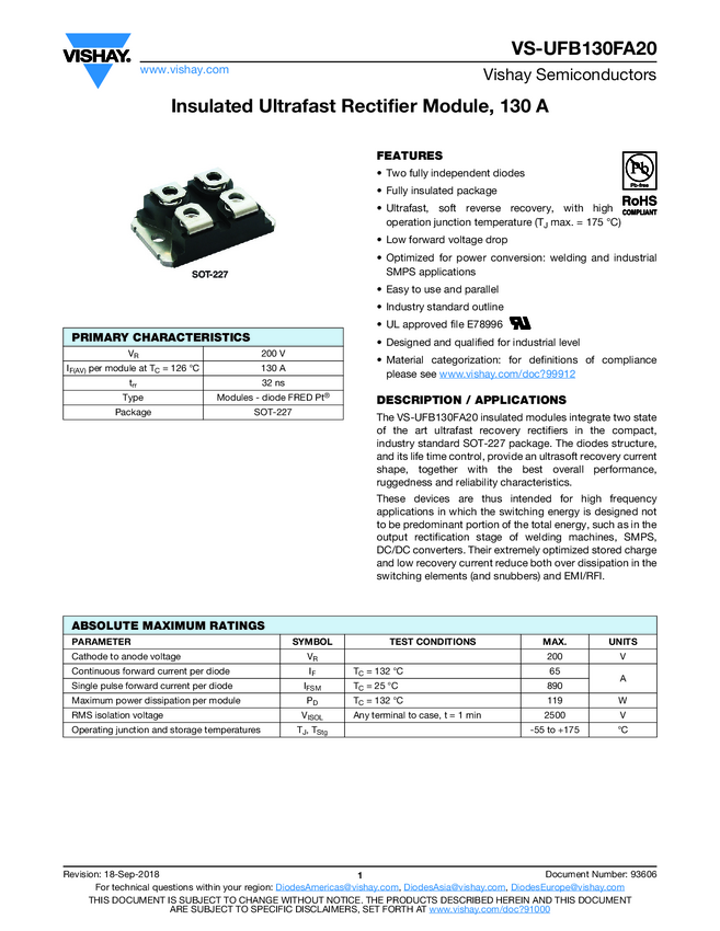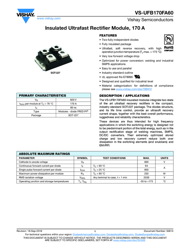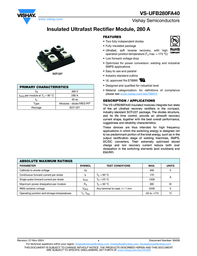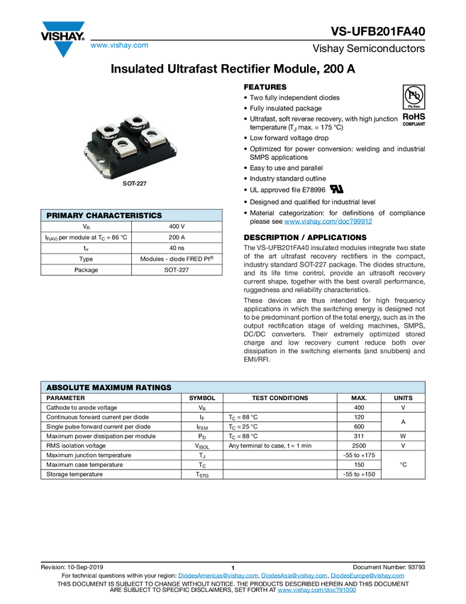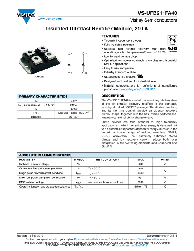 Not Insulated SOT-227 Power Module Ultrafast Rectifier, 310 A