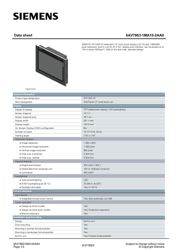 Panel obsługi PLC Siemens 6AV7863-1MA10-2AA0 6AV78631MA102AA0