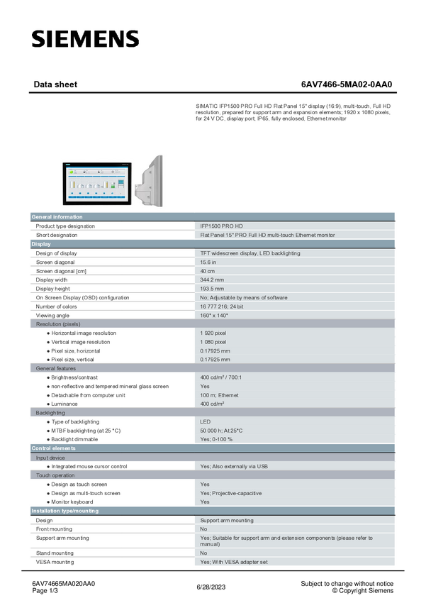 Panel obsługi PLC Siemens 6AV7466-5MA02-0AA0 6AV74665MA020AA0
