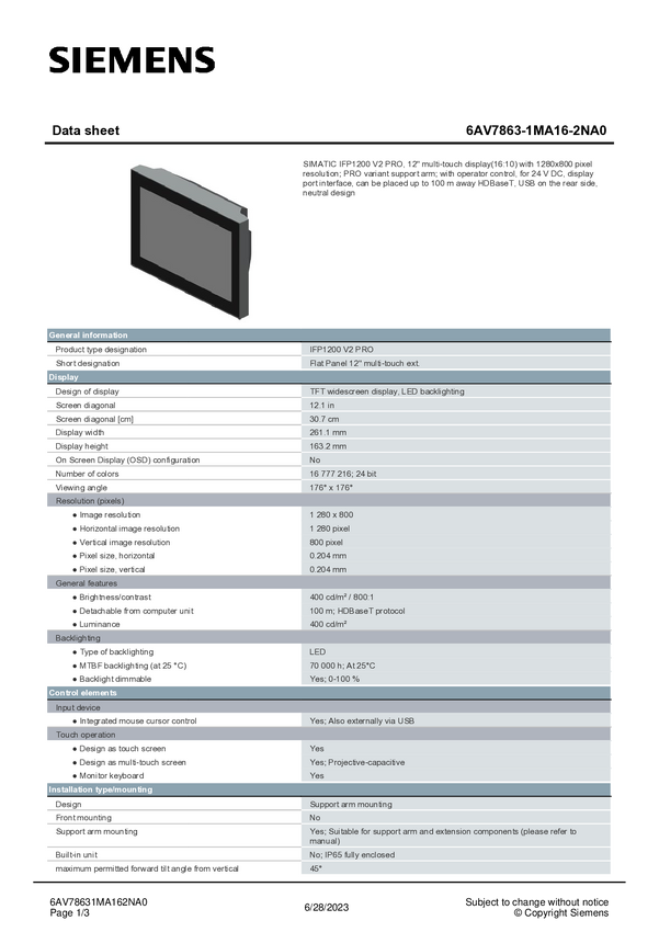 Panel obsługi PLC Siemens 6AV7863-1MA00-2NA0 6AV78631MA002NA0
