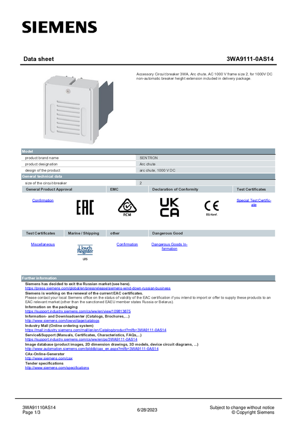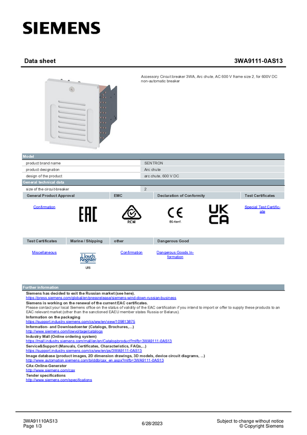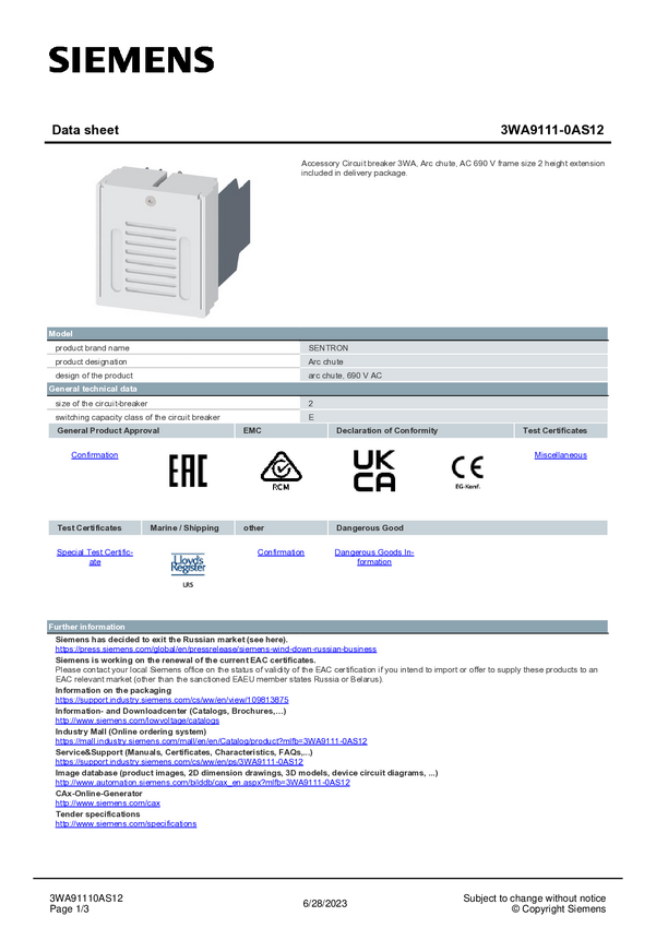 Komora łuku Siemens 3WA9111-0AS02 1 szt.