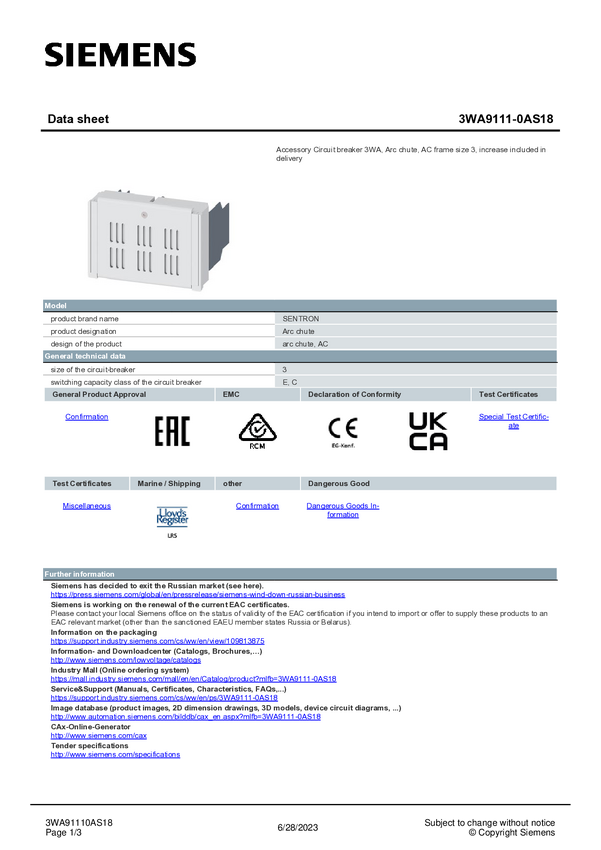 Komora łuku Siemens 3WA9111-0AS18 1 szt.