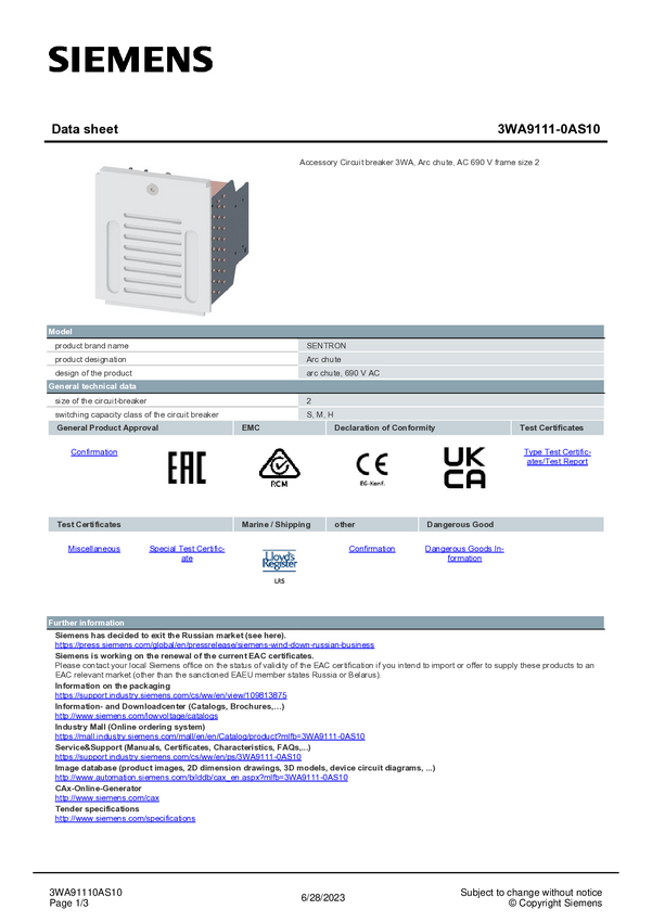 Komora łuku Siemens 3WA9111-0AS04 1 szt.