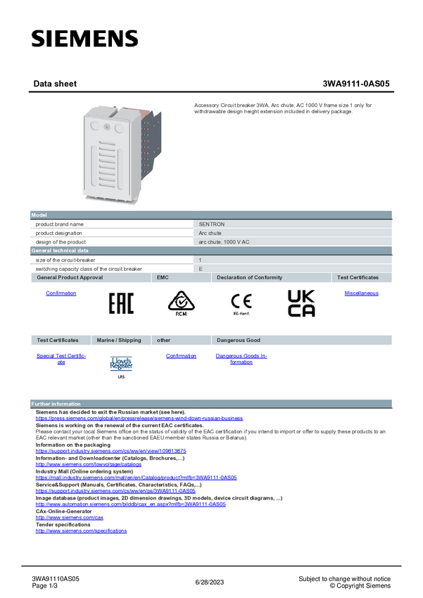 Komora łuku Siemens 3WA9111-0AS05 1 szt.