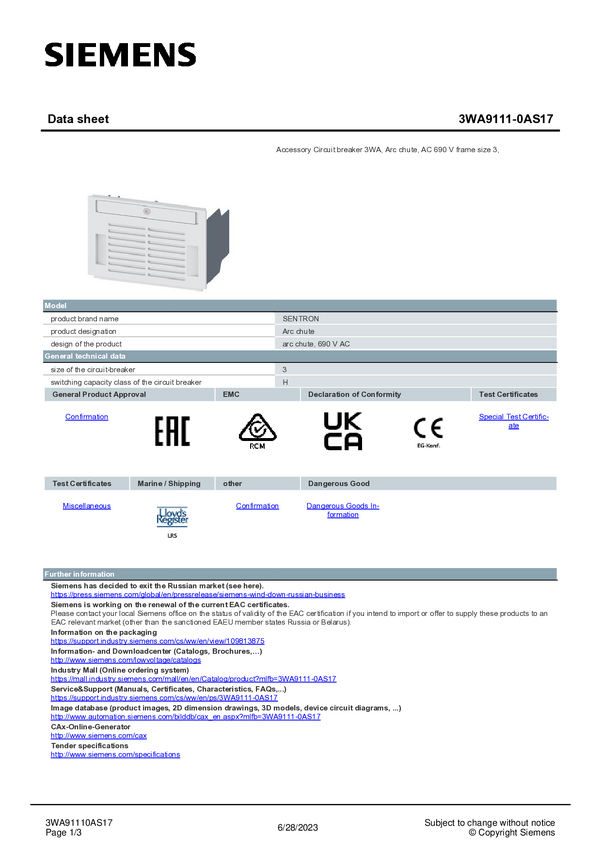 Komora łuku Siemens 3WA9111-0AS17 1 szt.
