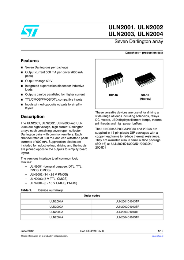 Układ scalony; ULN2003A; driver; darlington; 500mA; 50V; 7 kanałów; macierz tranzystorowa; DIP16; THT; = KID65003, MC1413P; STMicroelectronics; RoHS; opakowanie/100szt