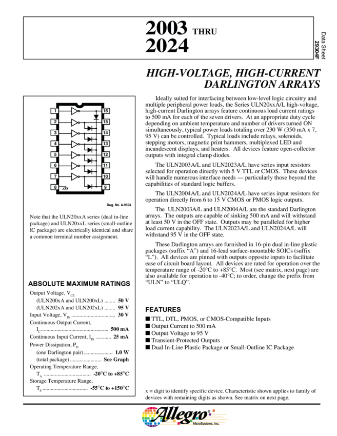 HIGH VOLTAGE, HIGH CURRENT DARLINGTON TRANSISTOR ARRAYS