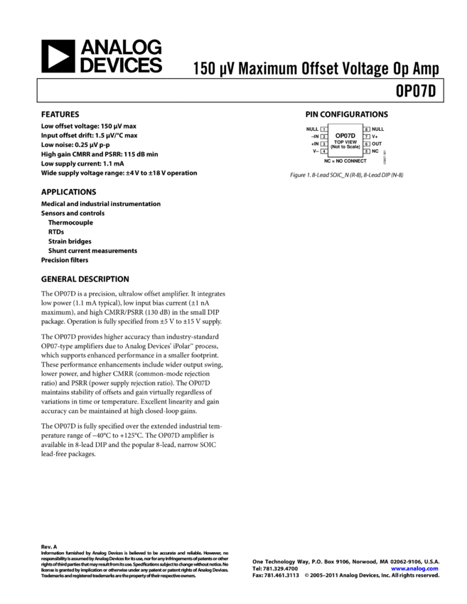 OP07D: Ultralow Offset Voltage Operational Amplifier
