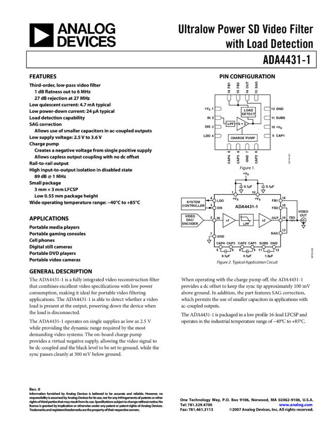 ADA4431-1: Ultralow Power SD Video Filter with Load Detection