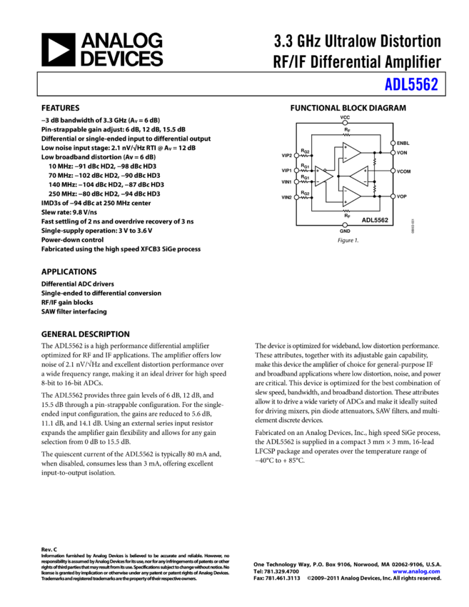 ADL5562: 3.3 GHz Ultralow Distortion RF/IF Differential Amplifier