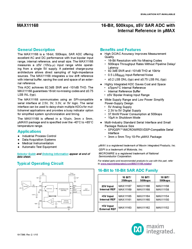 MAX11168 16-Bit 500ksps SAR ADC Pseudo-Differential Bipolar Input with Internal Reference in uMAX-10
