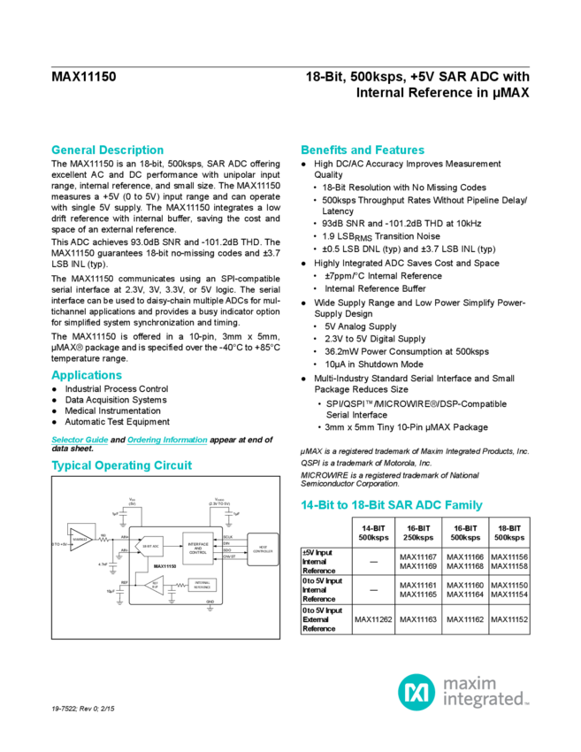 MAX11150 18-Bit 500ksps SAR ADC Pseudo-Differential Unipolar Input with Internal Reference in uMAX-10