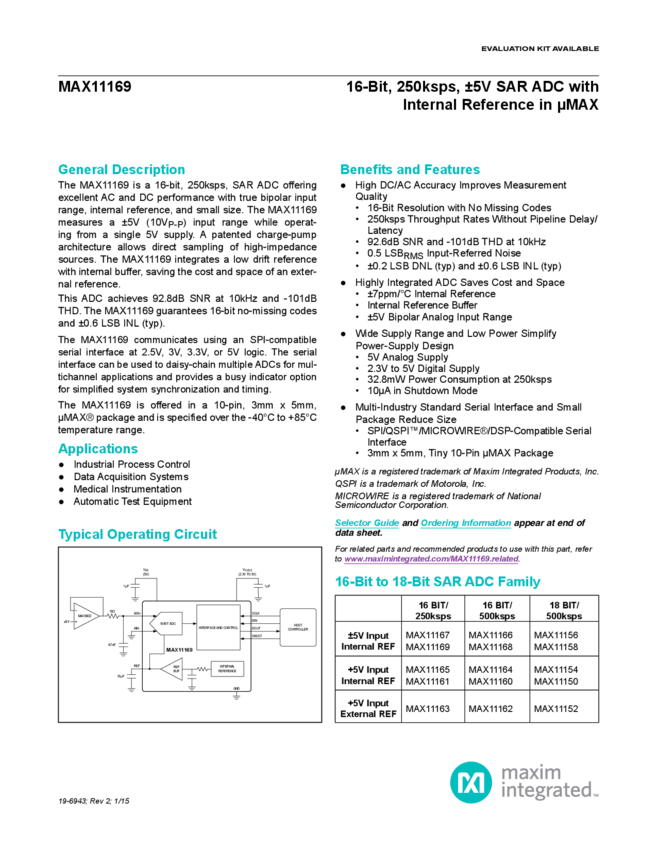 MAX11169 16-Bit 250ksps SAR ADC Pseudo-Differential Bipolar Input with Internal Reference in uMAX-10