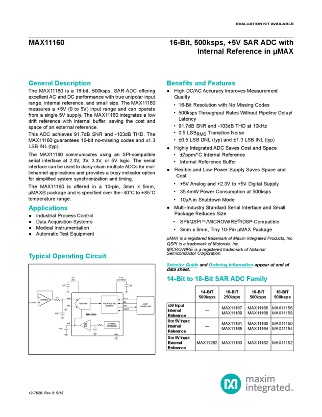 MAX11160 16-Bit 500ksps SAR ADC Pseudo-Differential Unipolar Input with Internal Reference in uMAX-10