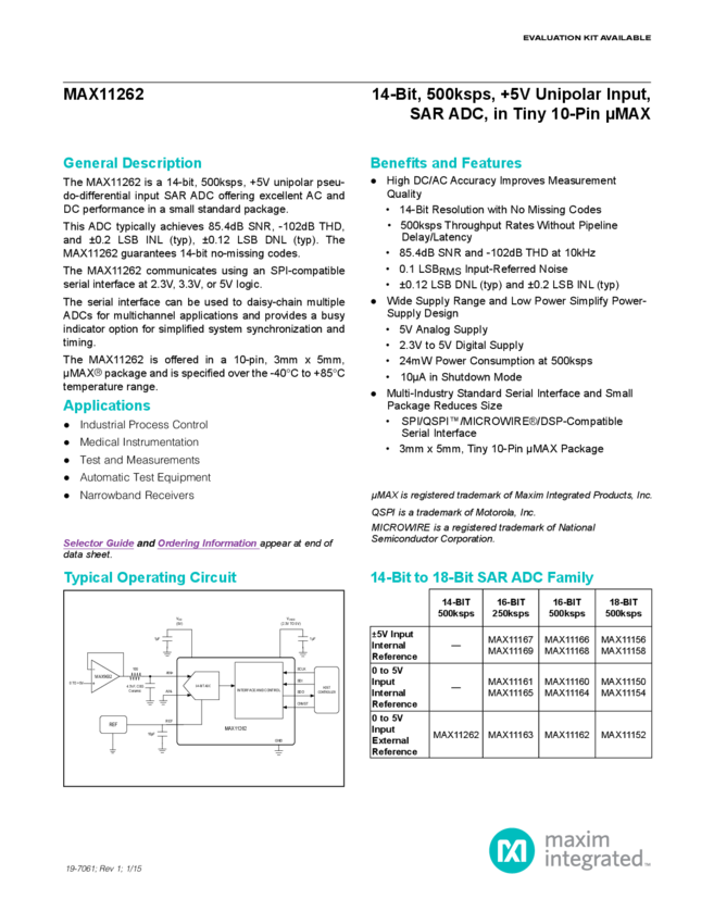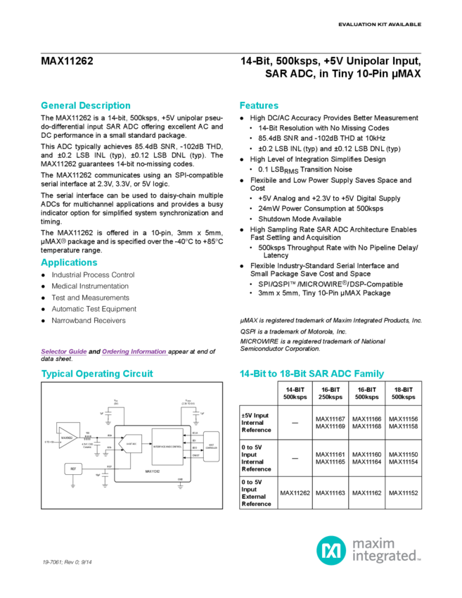 MAX11262 14-Bit 500ksps SAR ADC Pseudo-Differential Unipolar Input in uMAX-10
