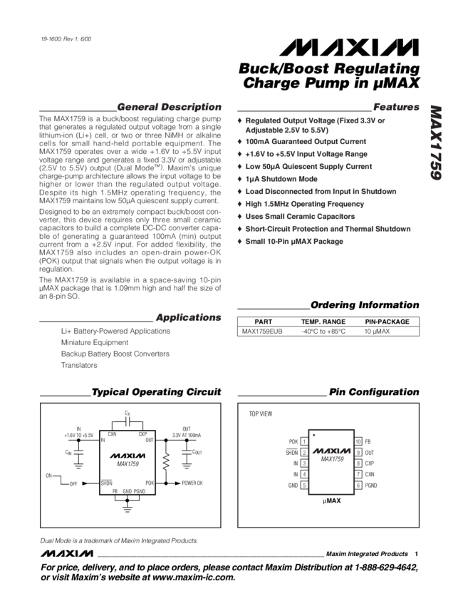MAX1759 100mA Buck/Boost Regulating Charge Pump in uMAX