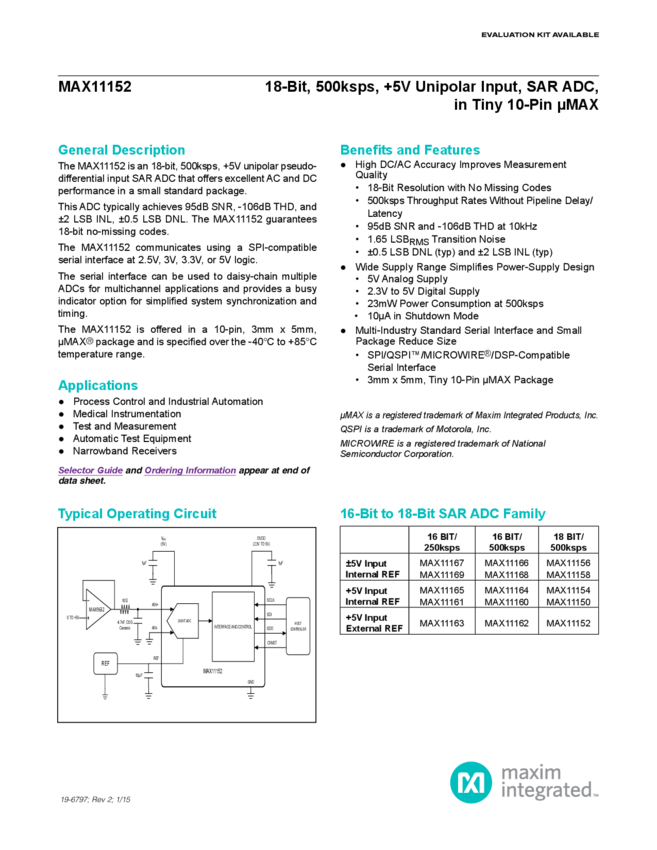 MAX11152 18-Bit 500ksps SAR ADC Pseudo-Differential Unipolar Input in uMAX-10