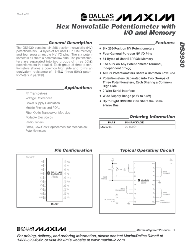 DS3930 Hex Nonvolatile Unbuffered DAC with I/O and Memory